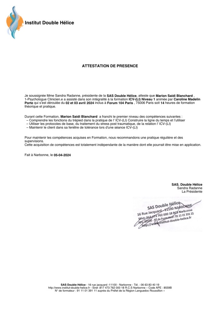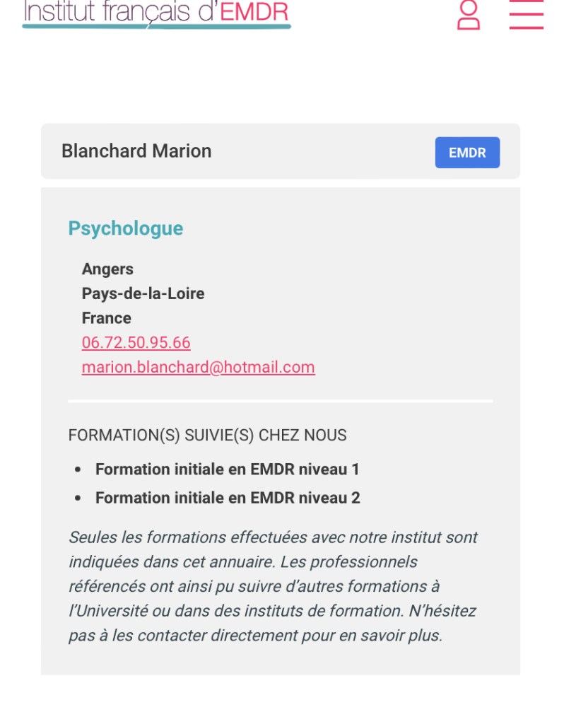 J’ai consulté Marion Saïdi Blanchard pendant plus d’un an. Elle m’a beaucoup aidé à comprendre et à régler des problèmes, j’en sors plus épanouie et apaisée. Je n’hésiterai pas à consulter à nouveau si le besoin se fait sentir.